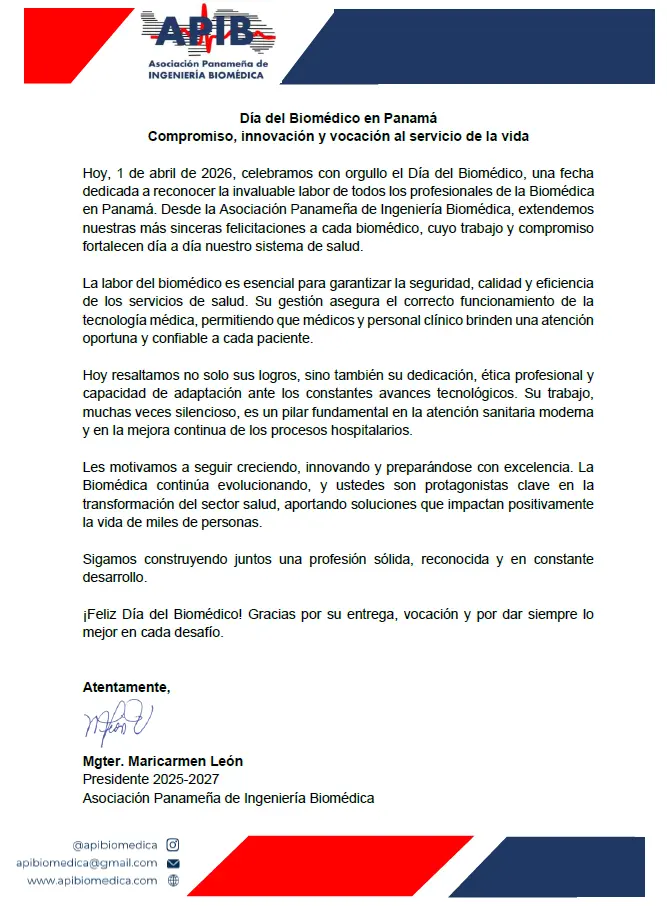 Hoy, 1 de abril de 2026, celebramos con orgullo el Día del Biomédico, una fecha dedicada a reconocer la invaluable labor de todos los profesionales de la Biomédica en Panamá. Desde la Asociación Panameña de Ingeniería Biomédica, extendemos nuestras más sinceras felicitaciones a cada biomédico, cuyo trabajo y compromiso fortalecen día a día nuestro sistema de salud.